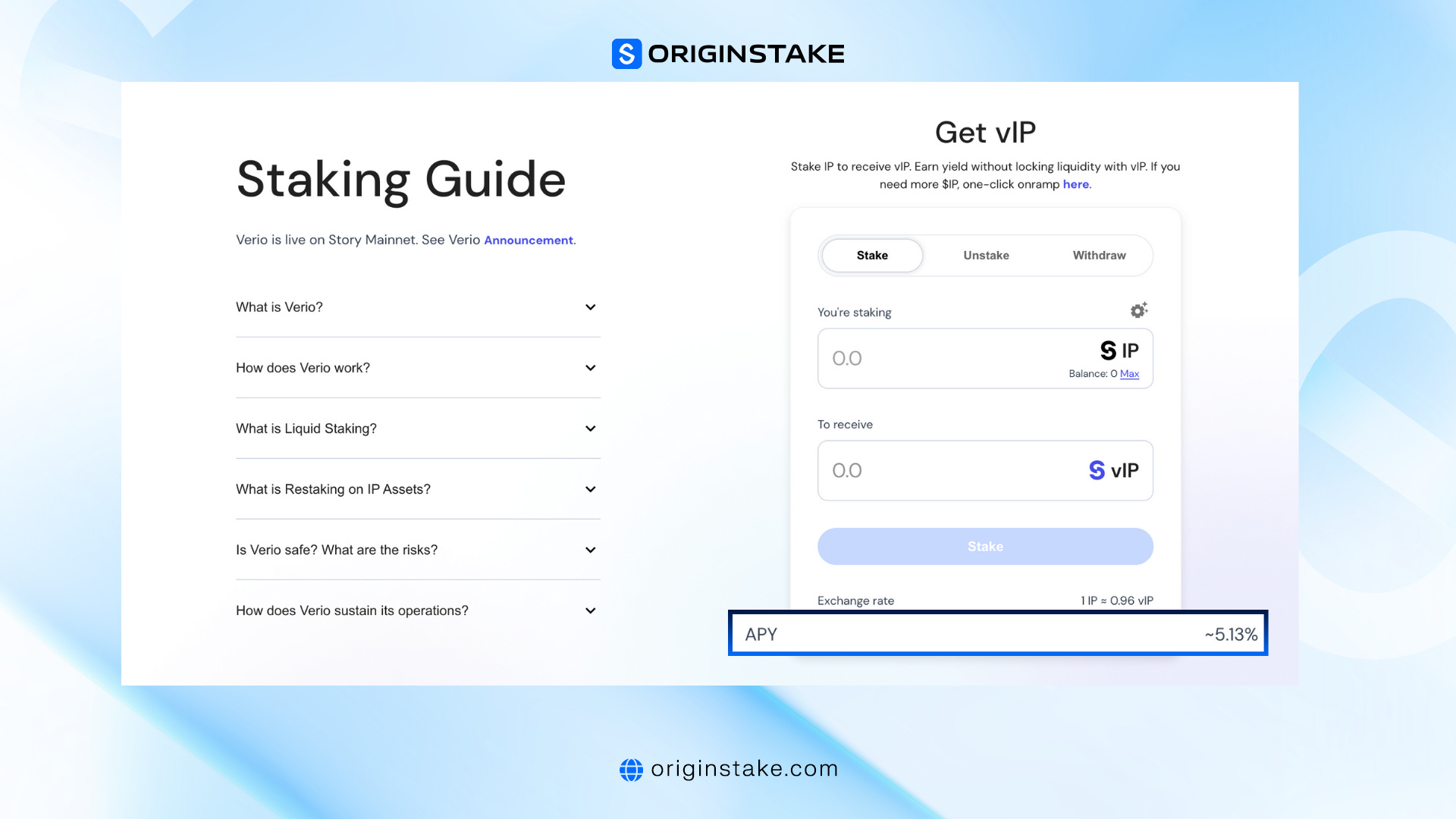 Farming the Verio airdrop is surprisingly straightforward. All you need to do is stake your $IP tokens on Verio to receive vIP, the liquid staking token that currently offers around 5% APY.